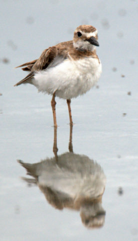 The bottom photo was taken in February, the time of year that plovers begin to molt back into their breeding plumage. Unfortunately, this one is still wearing its plain duds. Plus, we can’t see its legs and feet, so we don’t know what color they are. That leaves the beak, and what tan markings we can see from this angle.