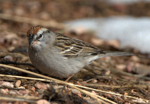 I was pretty sure that my unknown bird was related to a Chipping Sparrow (shown here) and other Emberizid Sparrows. See the resemblance?