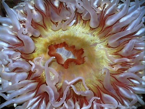 I should add a little blurb about sea anemones. Members of the phylum Coelenterata, they are closely related to coral and jellyfish. In fact, you can think of their basic body plan as a jellyfish turned upside down—a sac with tentacles all around the open end. Sea anemones start life as tiny planktonic larvae but eventually settle down, usually by attaching themselves to a rock or other solid object. They then live the rest of their very long lives (over a hundred years in some species) in one spot, dining on whatever happens to come along. I happen to think sea anemones are fascinating, but then I think everything alive is fascinating.