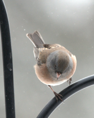 Most of the seed stays on the platform feeder, but enough falls off to attract a flock of ground feeding juncos. Imagine wanting to walk around barefoot in the snow! My feeders and poles are metal (the squirrels ate the wooden ones), and I cringe to see little bird feet holding on to the frozen steel. How do birds manage to avoid frostbitten toes?