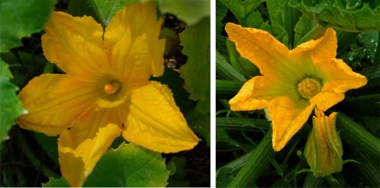 The flowers of cucumbers, zucchini, and other members of the squash are either male or female, and both types of flowers appear on the same plant. The male flower is on the left.