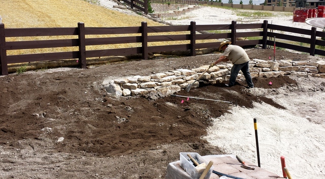 Several truckloads of rocks appeared on the empty lot behind our house, and the work began. We live on a slope, so three retaining walls were added to create level planting areas. I was grateful I wasn’t the one hefting all those rocks in the summer sun, and plied the workers with lemonade and cookies.