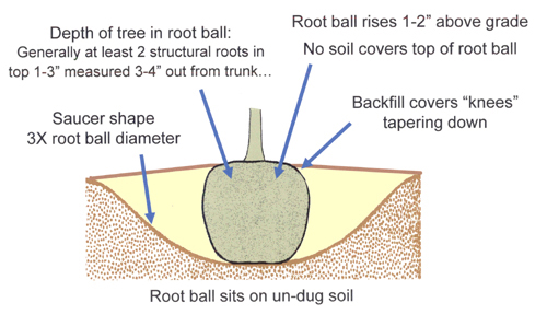 The next morning, I found burlap sticking out of the ground next to the largest, most expensive tree. Oops. More diagrams, more nodding and ahh-ing, more digging, and the root ball was exposed, the burlap removed, and the tree finally nestled safely in place.