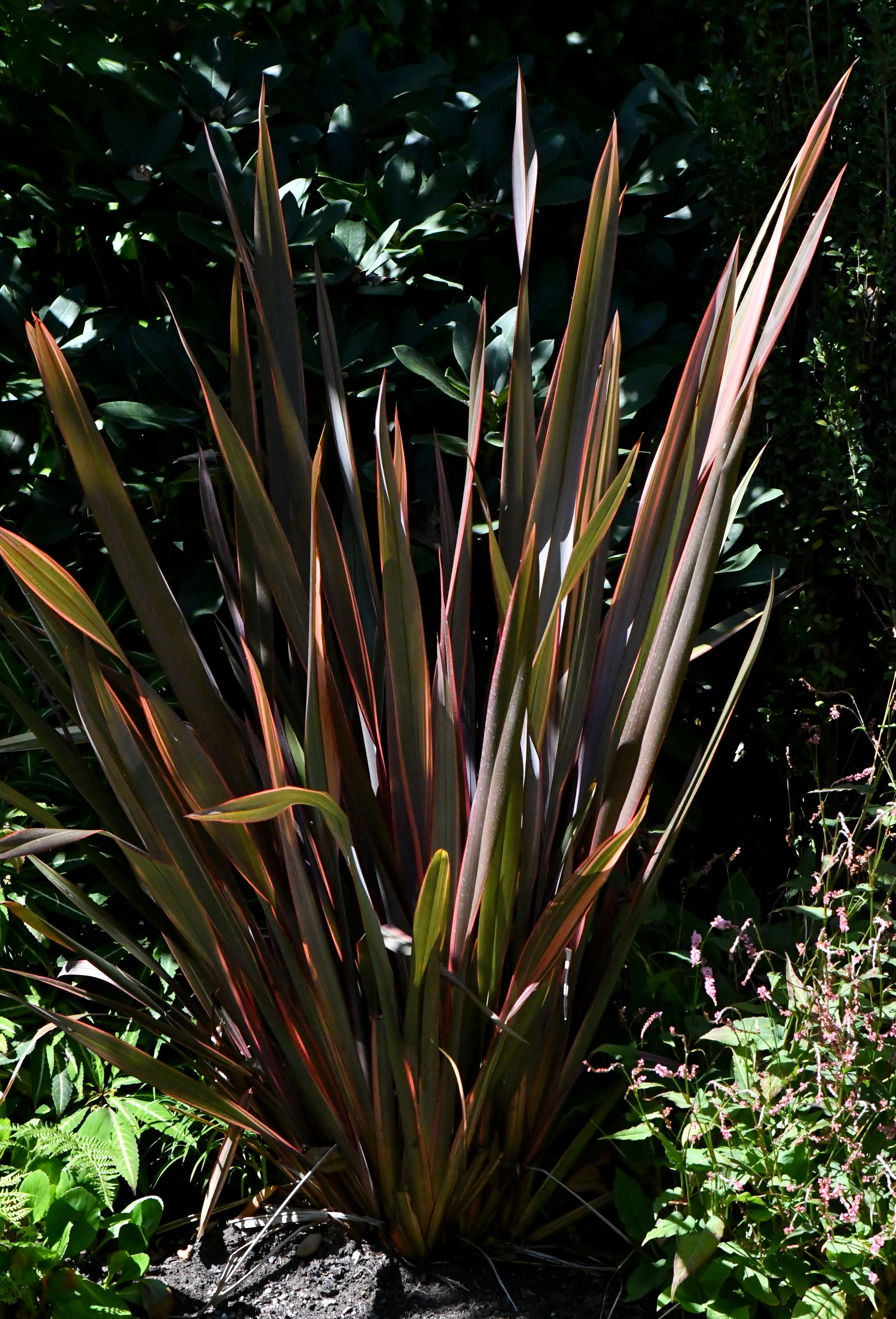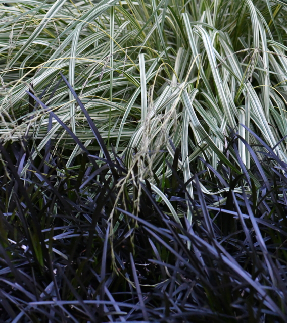 Whoever designed the garden clearly is fascinated by black foliage. Black Mondo grass (Ophiopogon japonicus) was paired with variegated ribbon grass, creating a startling black-and-white palette. Yellow dahlias with black foliage, deep purple taro (Colocasia esculenta ‘Black Magic’), and dark green and maroon New Zealand Flax continued the effect.