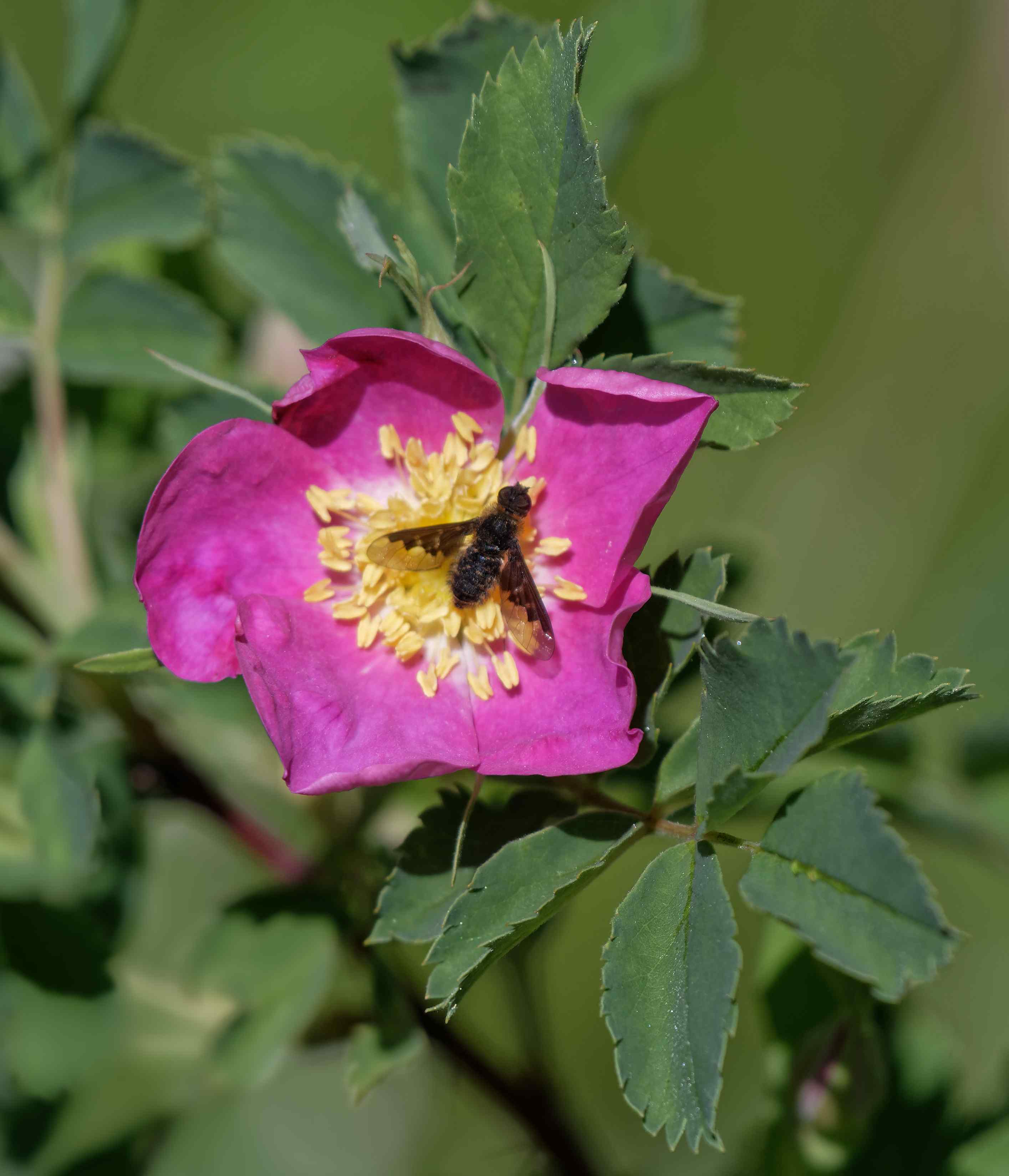 Posted on December 10, 2025October 27, 2025 in Invertebrates, Photography, Plants Sinuous Bee Fly on Wild Rose Hemipenthes sinuosa on Rosa woodsiiTeller County, Colorado